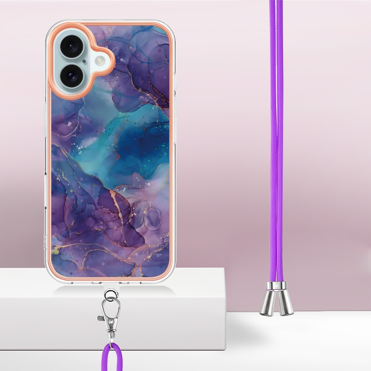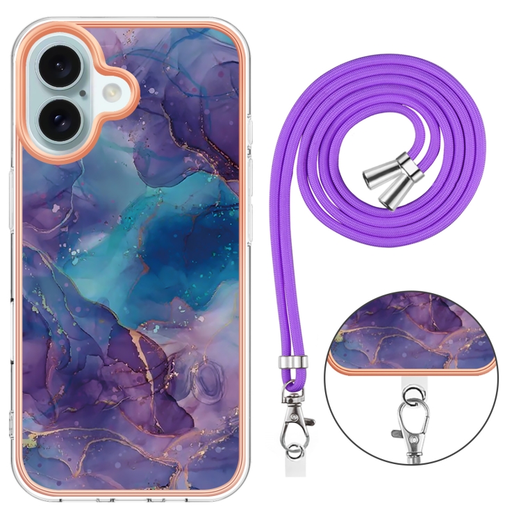 Estuche para Teléfono Imd Doble Cara con Revestimiento Mármol Galvanizado para iPhone 16 con Cordón (Púrpura)