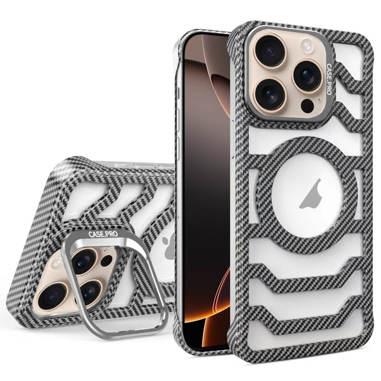 Estuche para Teléfono Magsafe con Soporte y Protección de Lente de Fibra de Carbono para iPhone 16 Pro (Gris)