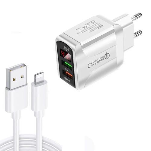 Cargador rápido F002C QC3.0 USB + USB 2.0 con pantalla digital y cable USB a 8 pin (Blanco)