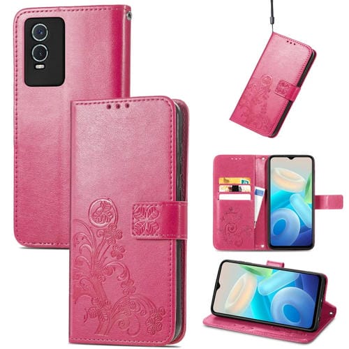 For Vivo Y76S Funda de Cuero En Relieve de Cuatro Hojas (Magenta)