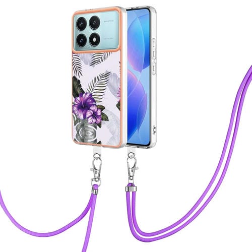 Funda a Prueba de Golpes con Patrón de Galvanoplastia Imd TPU para Xiaomi Poco F6 Pro 5G con Cordón para El Cuello (Flor Morada)