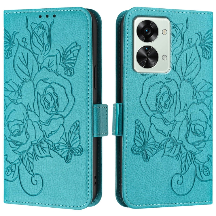Funda de Cuero Antirrobo para OnePlus Nord 2T con Diseño de Rosa en Relieve (Azul Claro)
