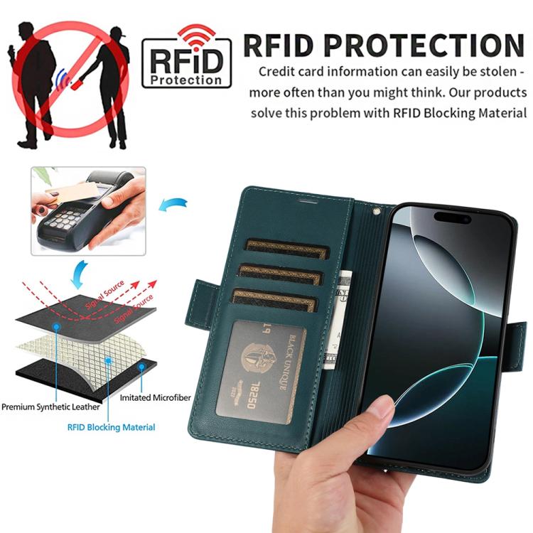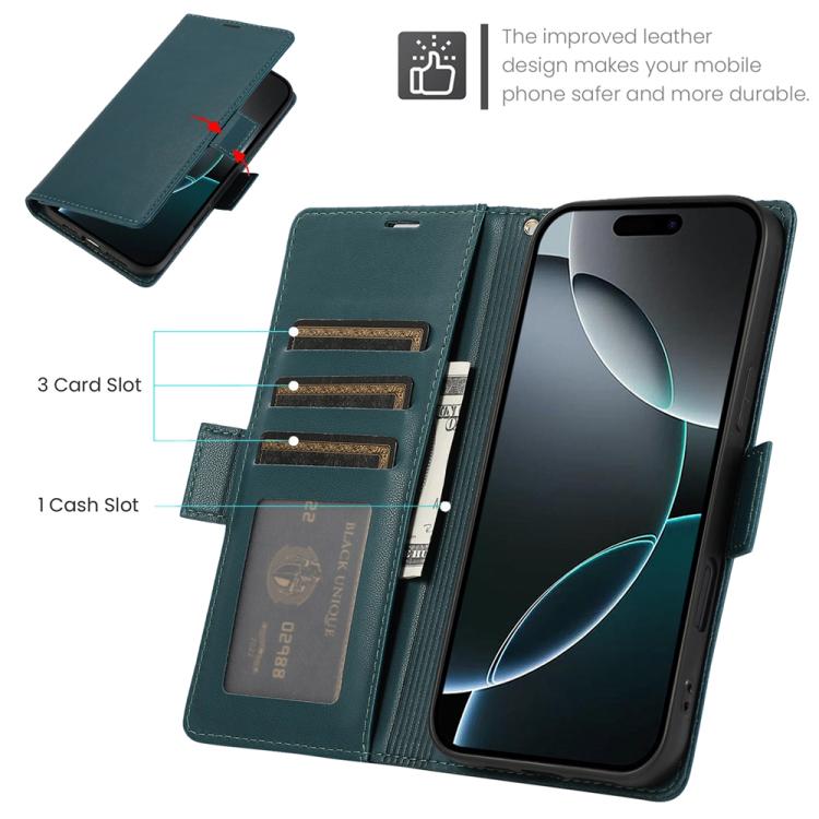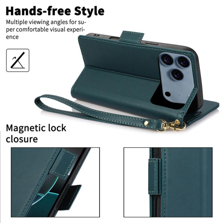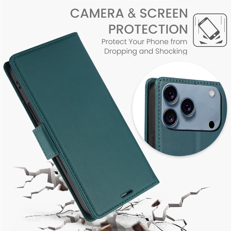 Funda de cuero antirrobo RFID con hebilla lateral para iPhone 17 Pro (verde)