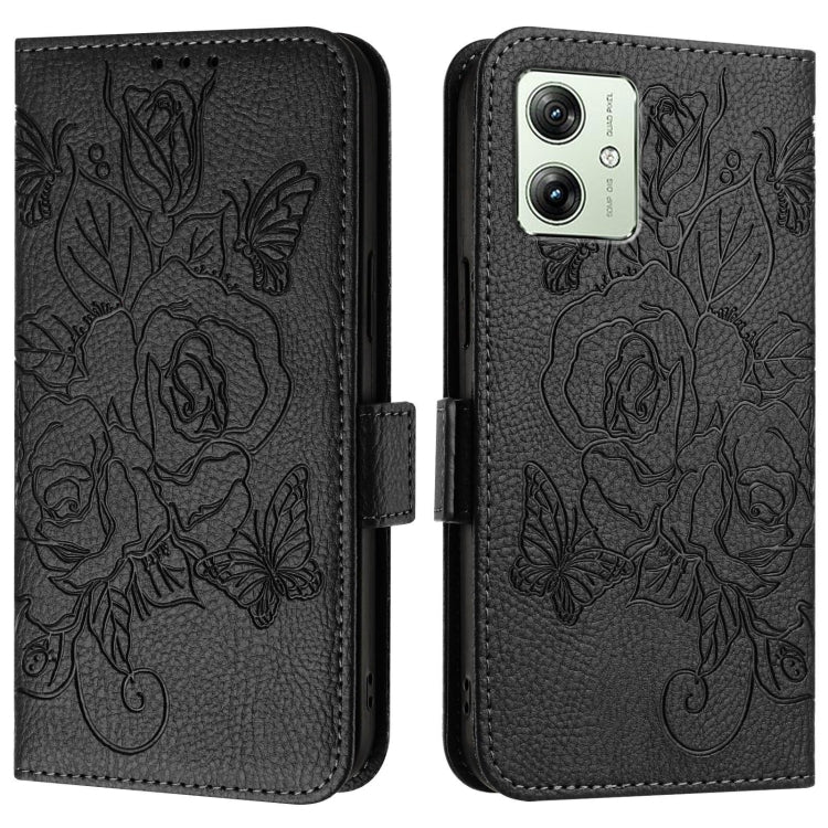 Funda de Cuero Antirrobo RFID con Relieve en Rosa para Motorola Moto G54 5G (Negra)