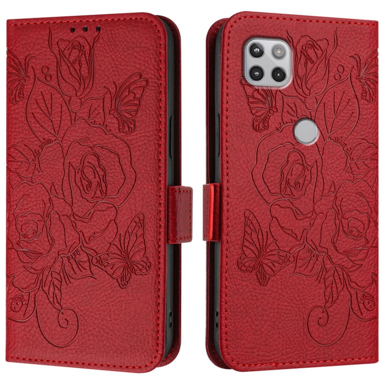 Funda de Cuero Antirrobo RFID con Relieve para Motorola Moto One 5G/G 5G 2020 (Rojo)