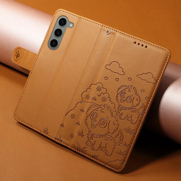 Funda de cuero con bloqueo RFID para Samsung Galaxy S23 5G, con diseño de corazón en relieve y perro (marrón)