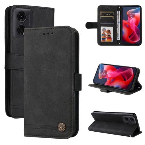 Funda de Cuero para Motorola Moto G04/G04S/G24/E14 con Botones de Metal y Diseño Árbol de la Vida (Negro)