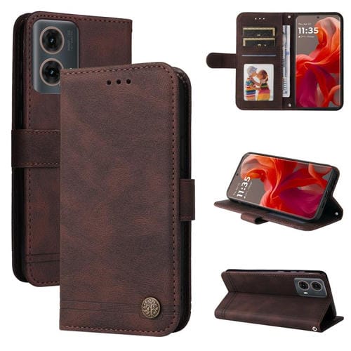 Funda de Cuero Motorola Moto G85/S50 Neo con Botones de Metal y Diseño Árbol de la Vida (Marrón)