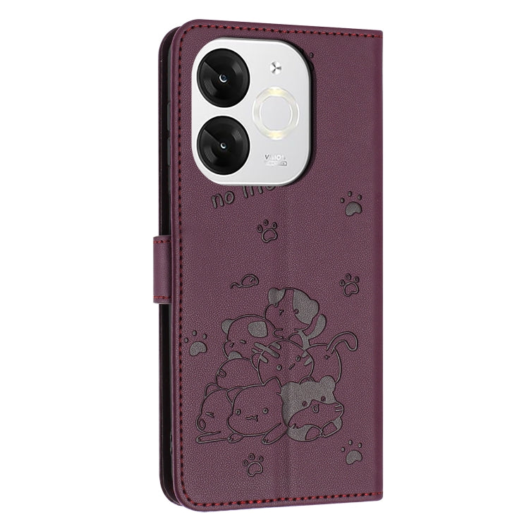 Funda de Cuero con Cordón para Teléfono Itel A80 con Diseño de Gatito en Relieve (Rojo Vino)