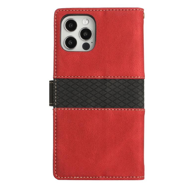 Funda de Cuero para iPhone 16 Pro Max con Costuras en Cuadrícula y Cordón (Rojo)