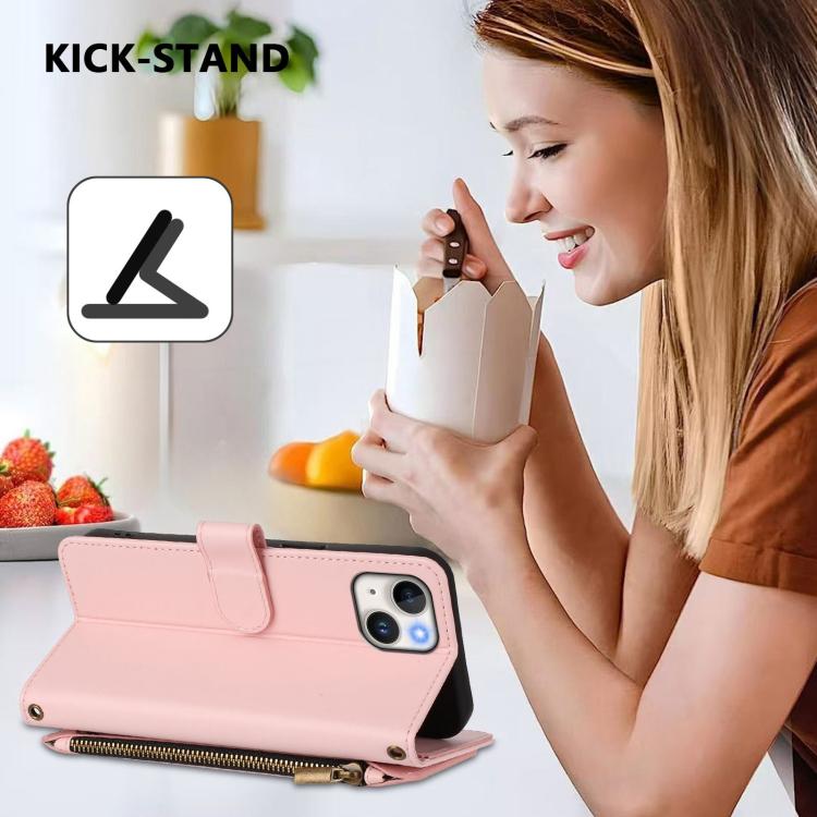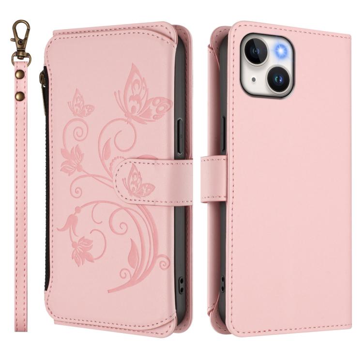 Funda de cuero con cremallera para iPhone 14 Plus, diseño de mariposas, flores y amor (rosa)