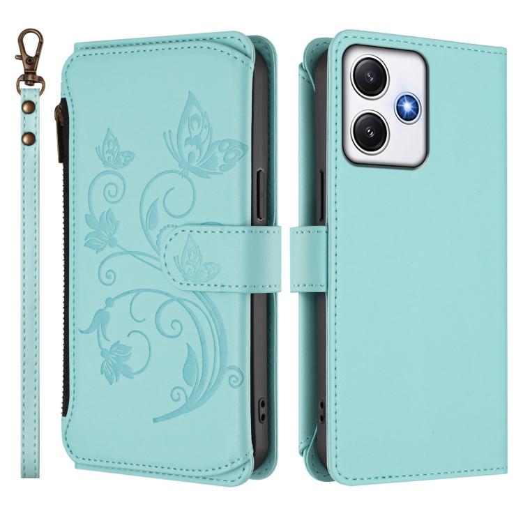 Funda de cuero con cremallera para Redmi 12 4G / 5G / Note 12R, diseño de mariposas, flores y mariposas (verde menta)
