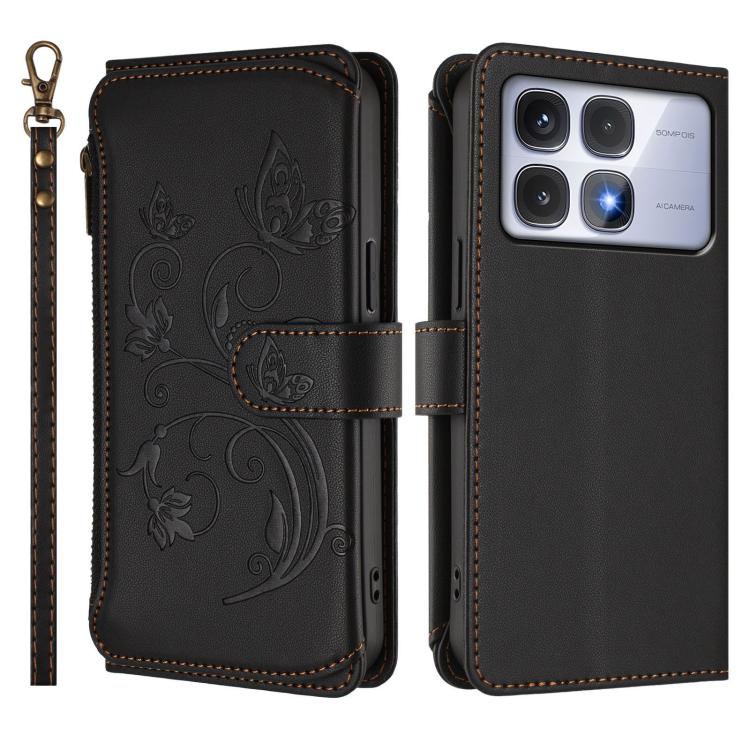 Funda de cuero con cremallera para Redmi K70 Ultra, diseño de mariposas y flores, con múltiples tarjetas (negro)