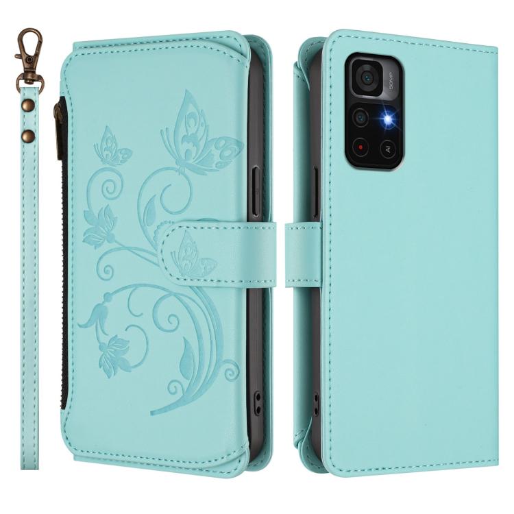 Funda de cuero con cremallera para Redmi Note 11S 5G / Xiaomi Poco M4 Pro 5G, diseño de mariposas y flores, con múltiples tarjetas (verde menta)