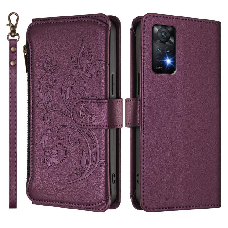 Funda de cuero con cremallera para Redmi Note 12 Pro 4G / Note 11 Pro 5G, diseño de mariposas, flores y múltiples tarjetas (morado oscuro)