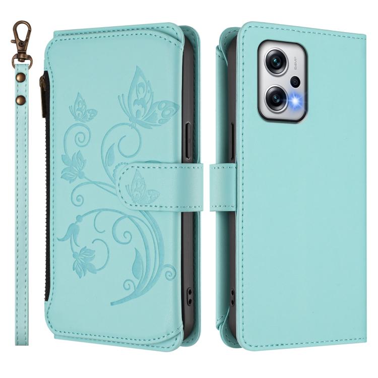 Funda de cuero con cremallera para Redmi Note 12T Pro / Redmi K50i, diseño de mariposas, flores y amor (verde menta)