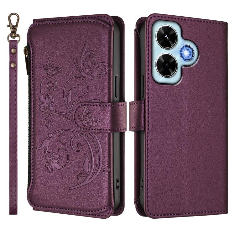 Funda de cuero con cremallera para Redmi Note 13 4G, diseño de mariposas, flores y múltiples tarjetas (morado oscuro)