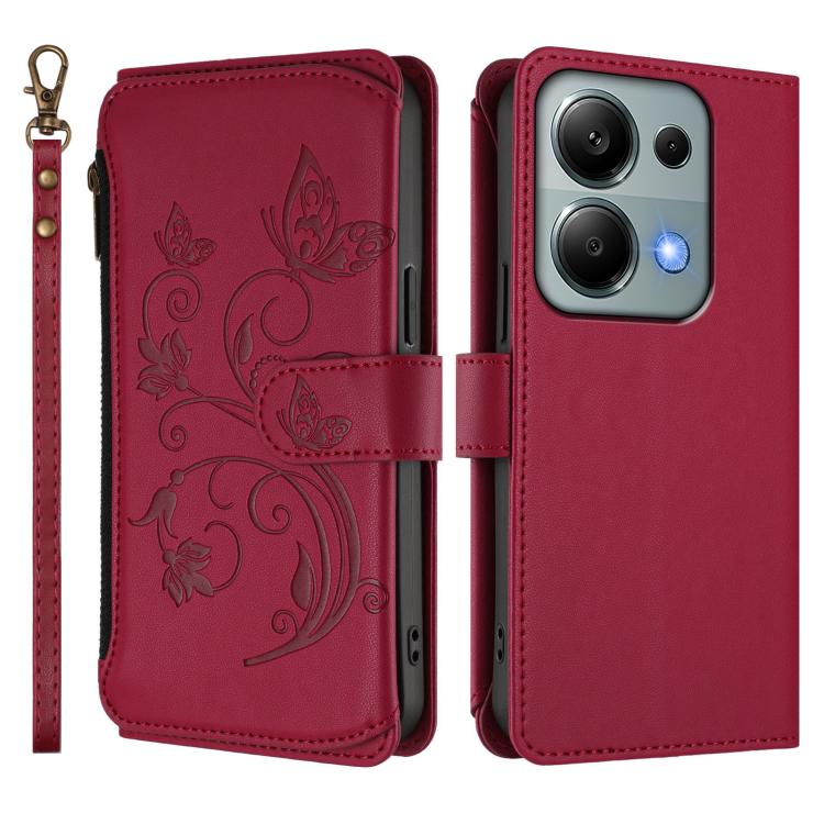 Funda de cuero con cremallera para Redmi Note 14S 4G / Note 13 Pro 4G, diseño de mariposas, flores y múltiples tarjetas (rojo vino)