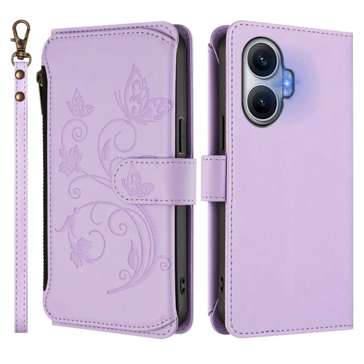 Funda de cuero con cremallera para Redmi Turbo 4 Pro y Xiaomi Poco F7, diseño de mariposas, flores y múltiples tarjetas (morado claro)