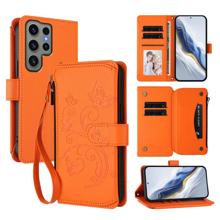 Funda de cuero con cremallera para Samsung Galaxy S23 Ultra 5G, diseño de mariposas, flores y amor, con múltiples tarjetas (naranja)