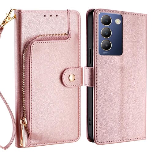 Funda de Cuero con Cremallera para Teléfono Vivo Y100 5G Idn (Oro Rosa)