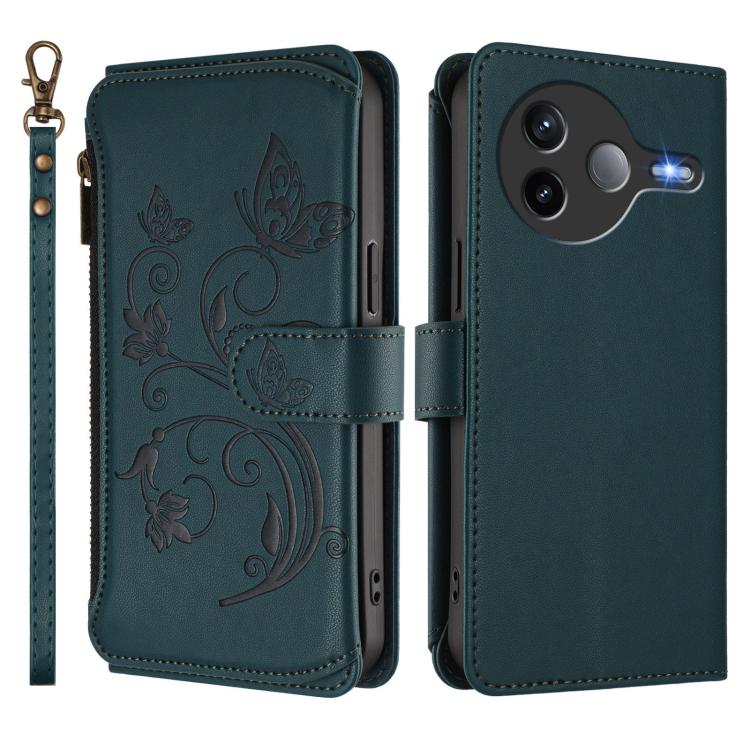 Funda de cuero con cremallera para Xiaomi Poco F7 Pro / Redmi K80, diseño de mariposas, flores y mariposas (verde oscuro)