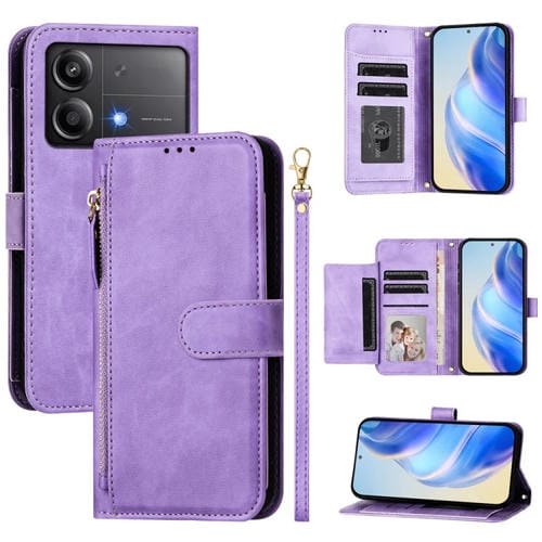 Funda de Cuero con Cremallera y Ranuras para Múltiples Tarjetas para Xiaomi Poco X6 Neo Global (Morado)