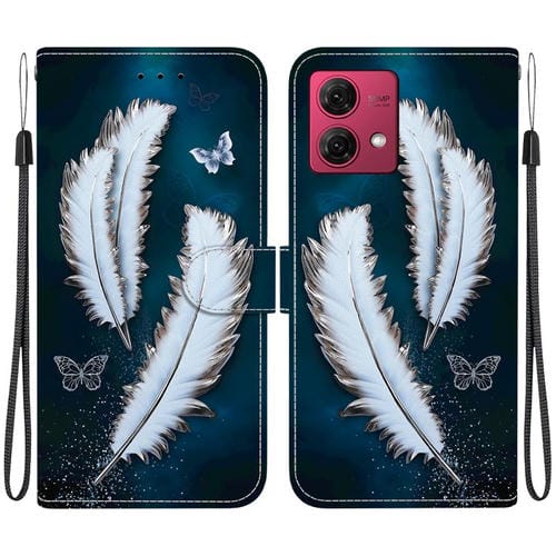 Funda de Cuero para Motorola Moto G84 con Dibujo de Colores y Textura de Cristal (Plumas de Mariposa Blancas)