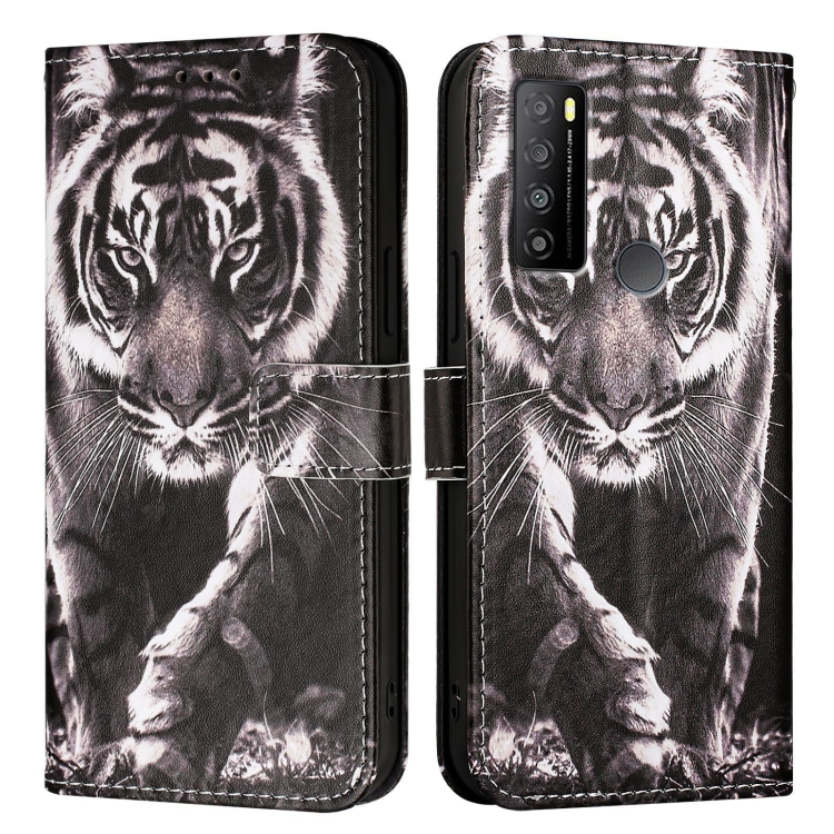 Funda de Cuero para TCL 30Z T602Dl con Diseño de Tigre Blanco y Negro