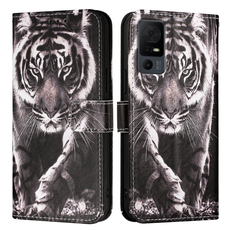 Funda de Cuero para TCL 40 XL/40T T608Dl con Diseño Tigre Blanco y Negro