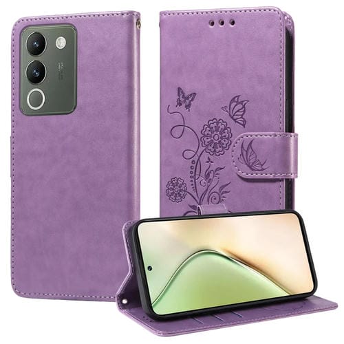 Funda de Cuero con Diseño de Mariposas y Flores En Relieve para Vivo Y200/V29E (Morado)