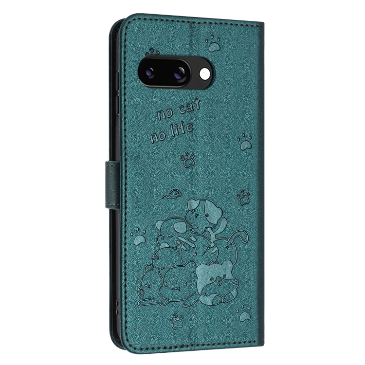 Funda de Cuero para Google Pixel 9A con Diseño de Gatito en Relieve y Cordón (Verde Oscuro)