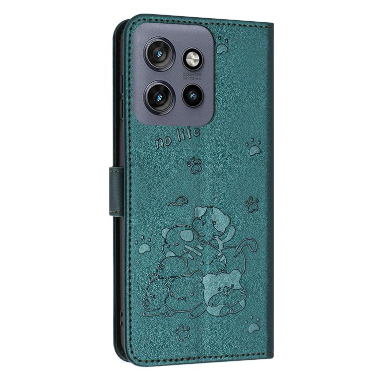 Funda de Cuero Motorola Moto G Power/G Play 2025 con Diseño de Gatito en Relieve y Cordón (Verde Oscuro)