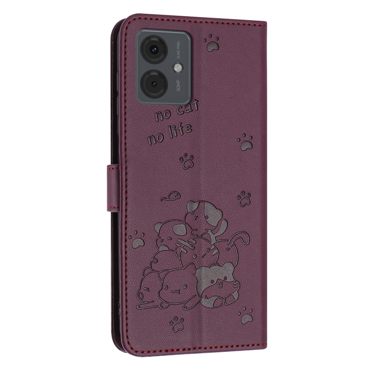 Funda de Cuero Motorola Moto G04/G24/G04S con Diseño Gatito en Relieve y Cordón (Rojo Vino)
