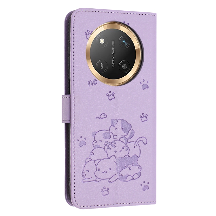 Funda de Piel para Honor X9C con Diseño de Gatito en Relieve y Cordón (Morado)