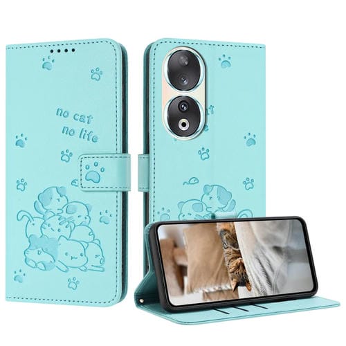 Funda de Piel con Diseño de Gatito en Relieve para Honor 90 con Cordón (Verde Menta)