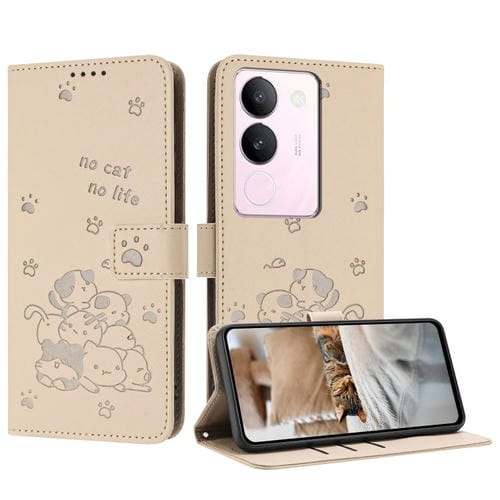 Funda de Piel con Diseño de Gatito En Relieve y Cordón para Vivo S17/S17 Pro/S17T (Beige)