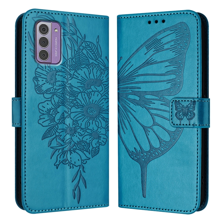 Funda de Cuero para Nokia G42/G310 con Diseño de Mariposa en Relieve (Azul)
