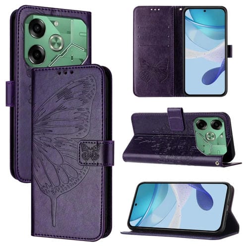 Funda de Cuero para Tecno Pova 6 con Diseño de Mariposa en Relieve (Morado Oscuro)