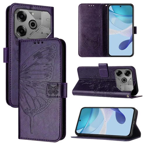 Funda de Cuero para Tecno Pova 6 Neo con Diseño de Mariposa en Relieve (Morado Oscuro)