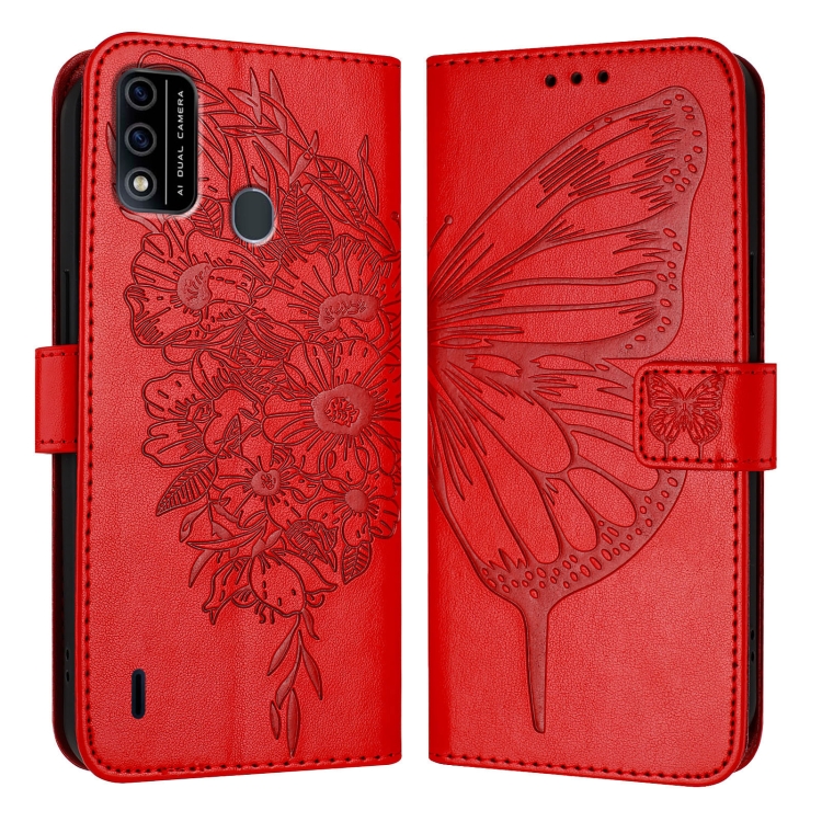 Funda de Cuero para Teléfono Itel A48 con Diseño de Mariposa en Relieve (Rojo)