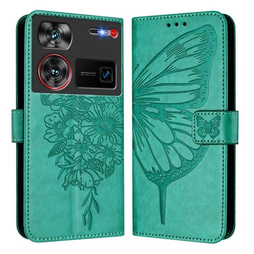 Funda de Cuero para ZTE Nubia Z60 Ultra con Diseño de Mariposa en Relieve (Verde)