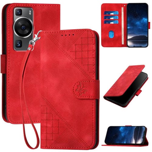 Funda de Cuero Huawei P60/P60 Pro con Diseño de Mariposa en Relieve y Cordón (Rojo)