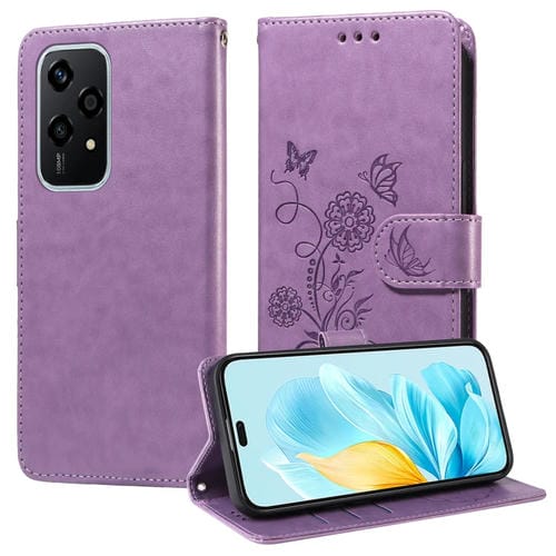 Funda de Cuero Honor 200 Lite Diseño Mariposas y Flores en Relieve (Morado)
