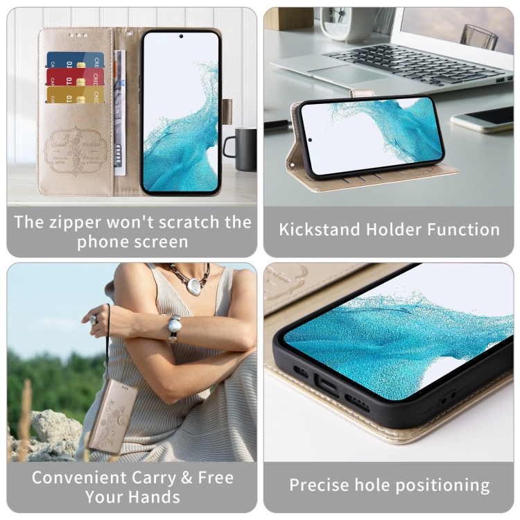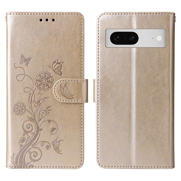 Funda de Cuero con Diseño de Mariposas y Flores en Relieve para Google Pixel 7 Pro (Dorada)