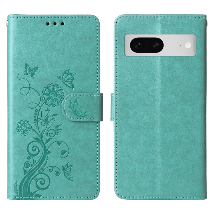 Funda de Cuero para Google Pixel 7 Pro con Diseño de Mariposas y Flores en Relieve (Verde)