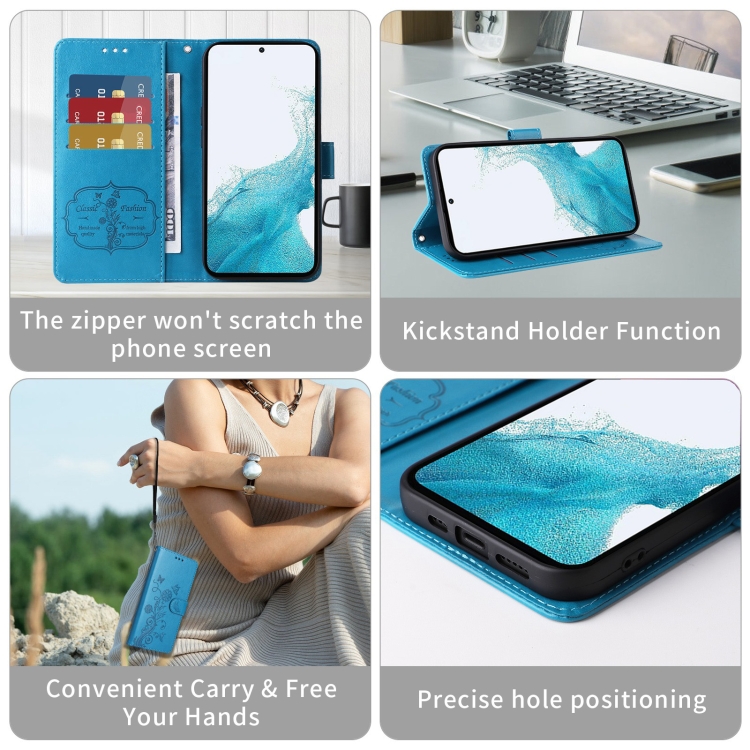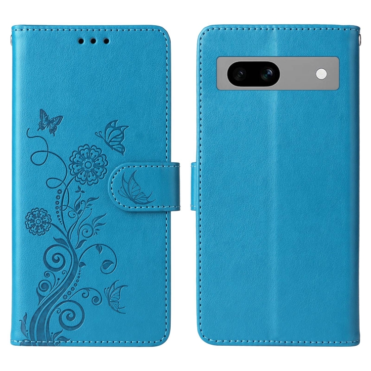 Funda de Cuero con Diseño Mariposas y Flores en Relieve para Google Pixel 7A (Azul)