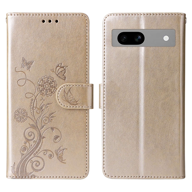 Funda de Cuero para Google Pixel 7A con Diseño de Mariposas y Flores en Relieve (Dorada)