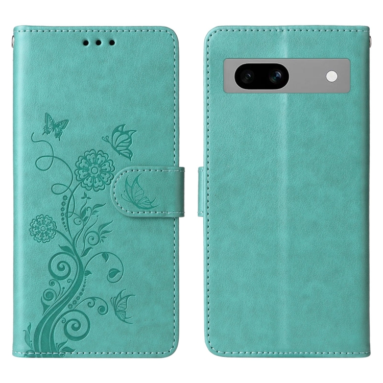 Funda de Cuero para Google Pixel 7A con Diseño de Mariposas y Flores en Relieve (Verde)