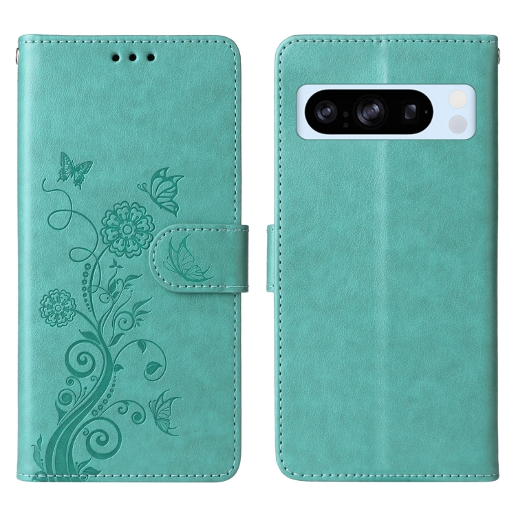 Funda de Cuero para Google Pixel 8 Pro con Diseño de Mariposas y Flores en Relieve (Verde)